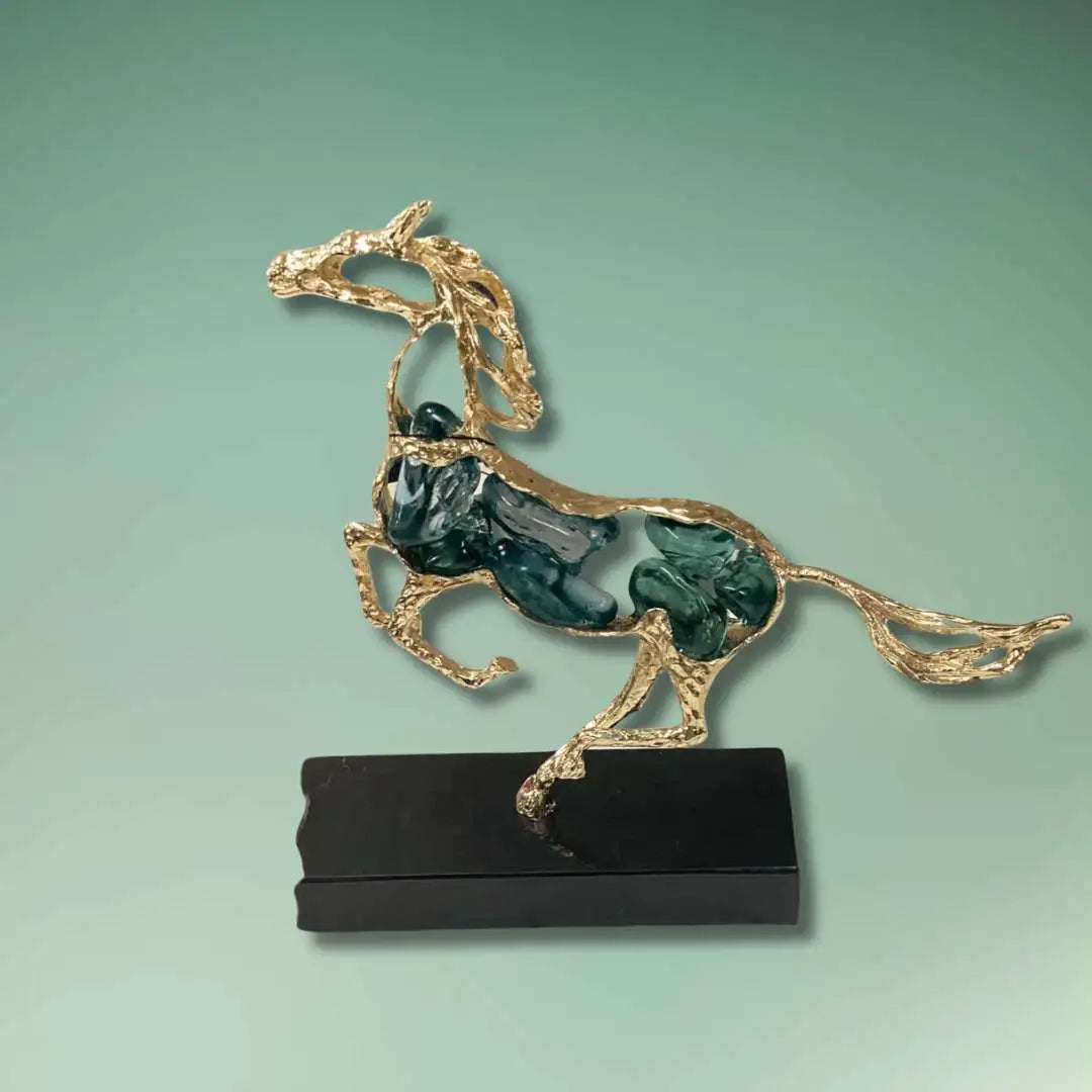 The Abstract Horse Sculpture captures the essence of speed and grace, blending modern design with artistic ingenuity. Featuring a golden frame intertwined with green glass-like accents, this piece is a stunning addition to any contemporary decor.