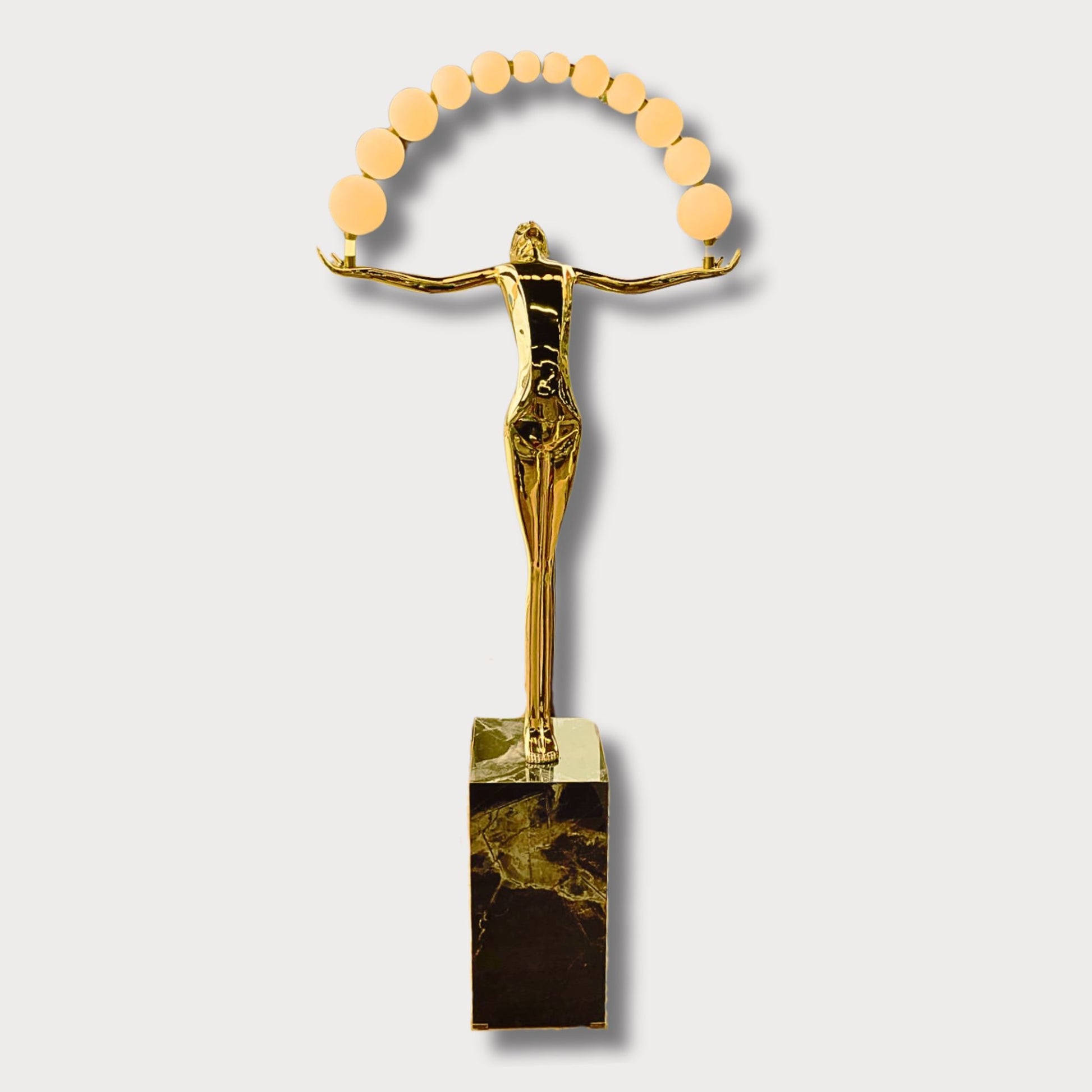 Bring a touch of luxury to your space with the Celestial Arc LED Sculpture Lamp—a masterpiece that combines art and function. This limited-edition lamp showcases a golden figure gracefully holding a glowing arc of lights, making it more than just a lamp; it’s a true statement piece. Perfect for adding elegance and character to any room.