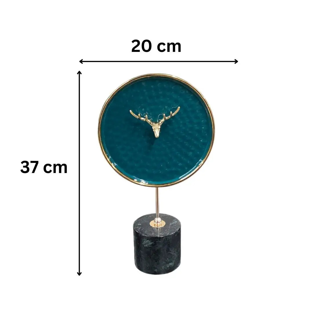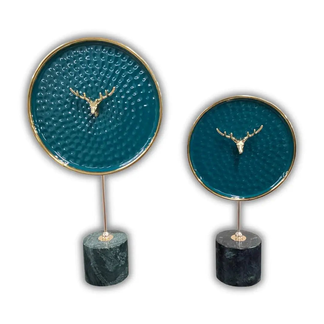The Deer Antler Decorative Discs are a stunning addition to any space, featuring a textured teal plate with gold antler accents and a sturdy marble base. Available in two sizes, these pieces exude sophistication and charm.