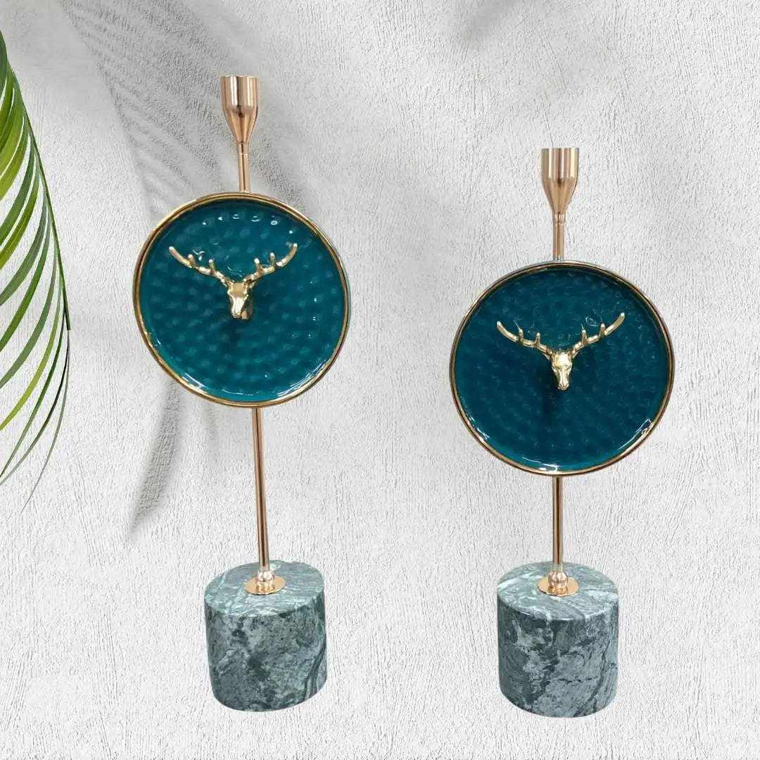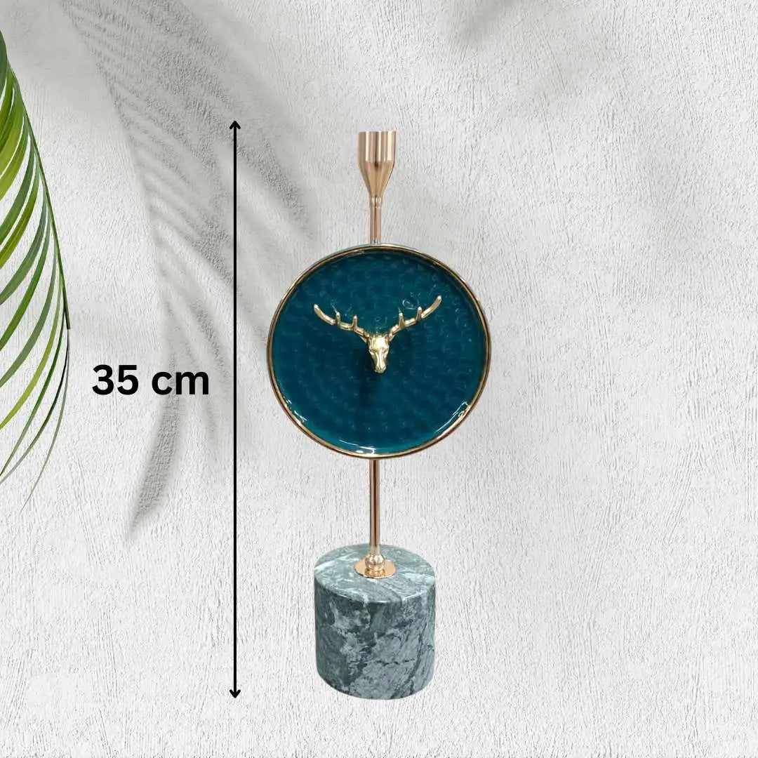 The Green Circular Candle Holders are a sophisticated addition to any decor. Featuring a rich green circular design with a golden antler motif, these pieces are mounted on a luxurious green marble base. Designed for holding candles, they combine artistry and functionality effortlessly.